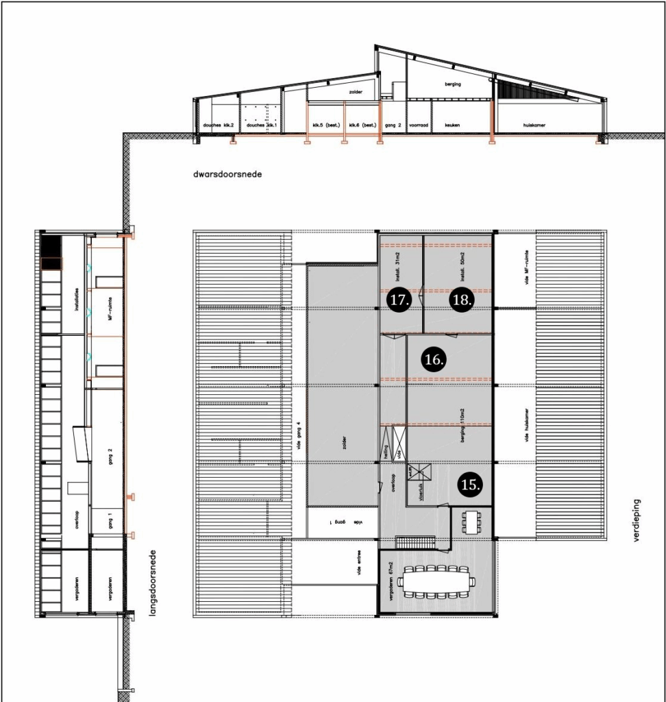 - Een bovenverdieping met een grote spreekkamer, met berging en machinekamer/werkplaats – de berging biedt ruimte voor de diverse vaste gebruikers om zaken op te slaan
